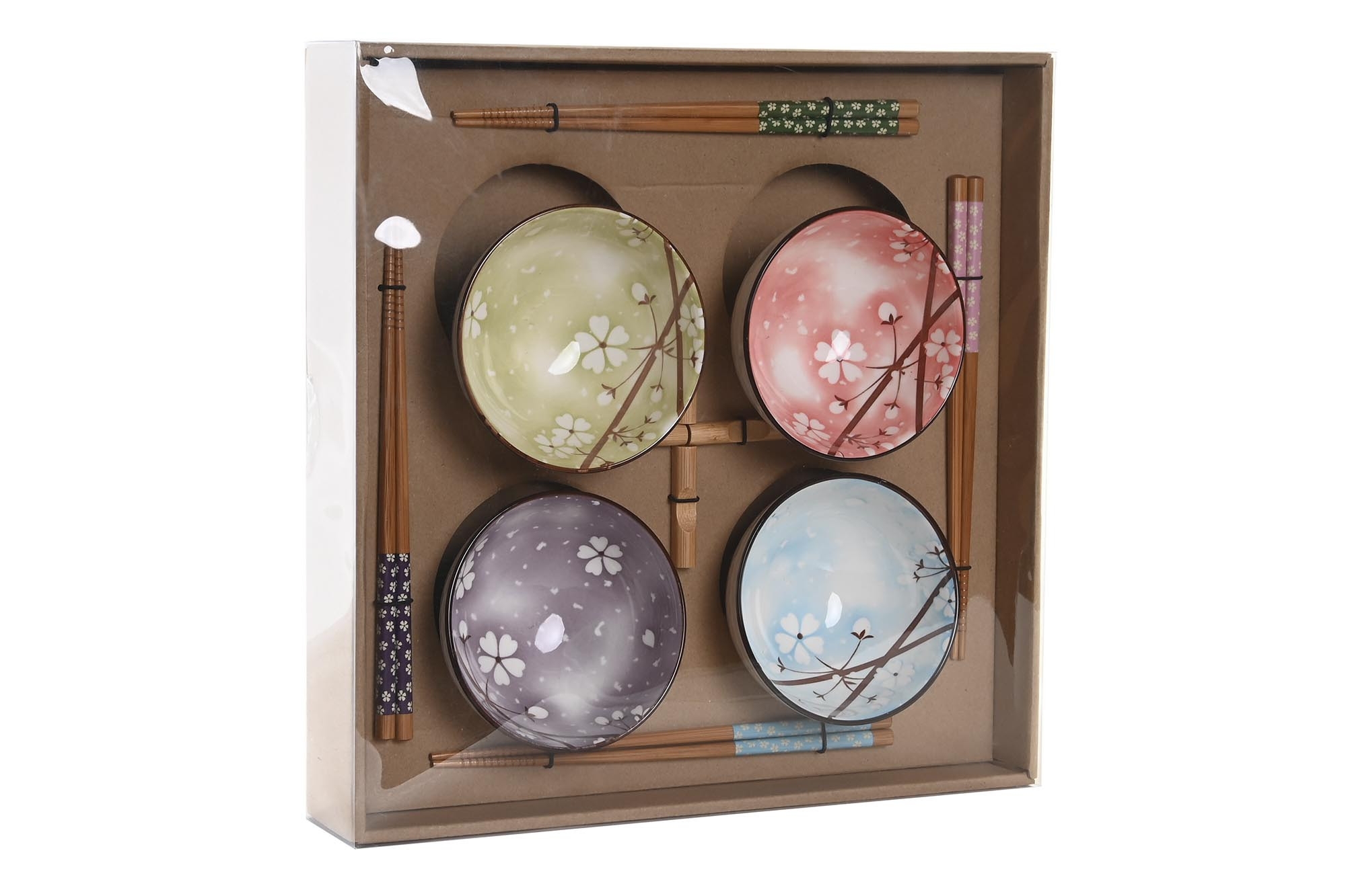 Set štyroch kusov kameninových misiek s bambusovými čínskymi paličkami 39530