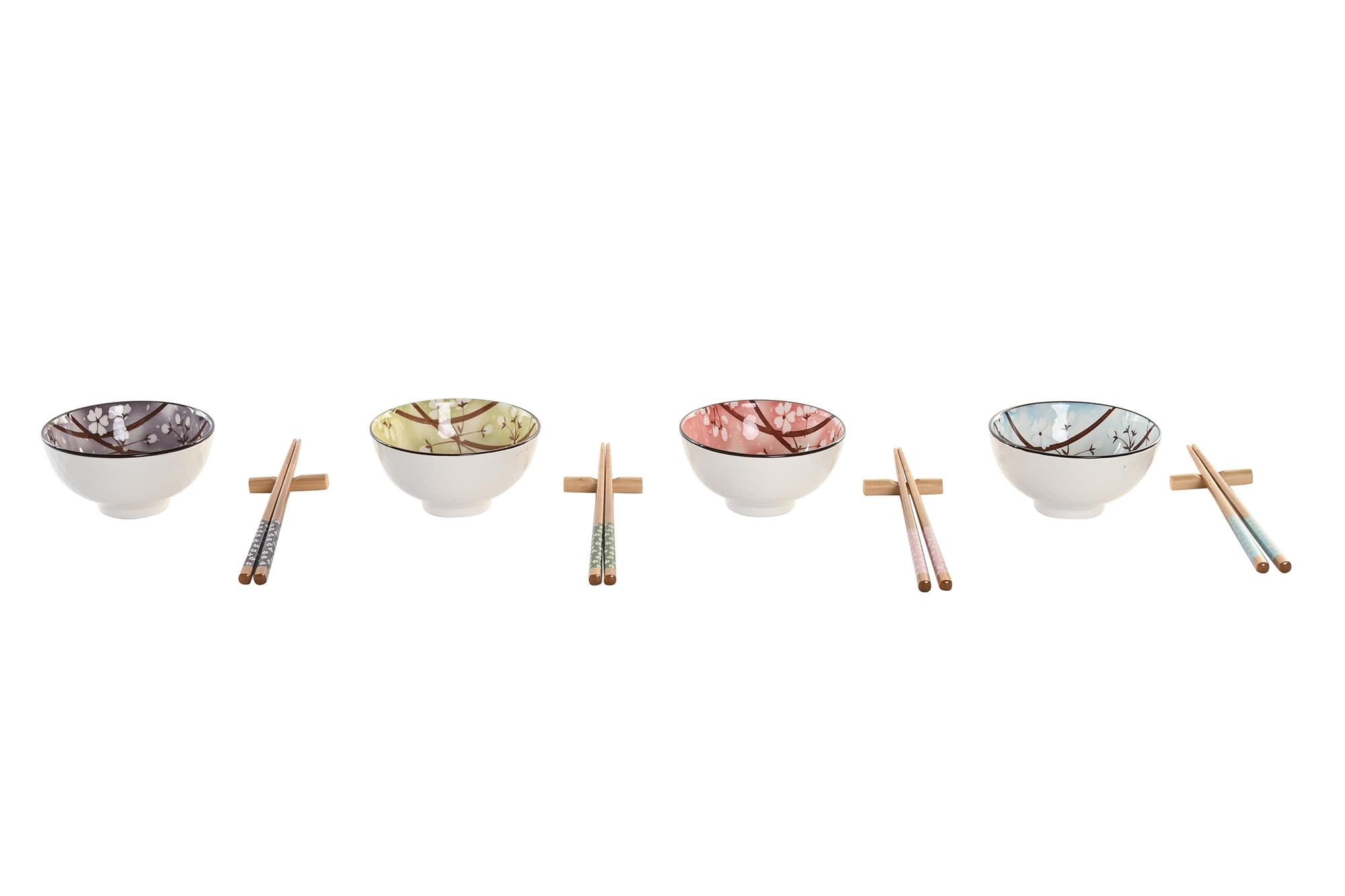 Set štyroch kusov kameninových misiek s bambusovými čínskymi paličkami je originálnym a jedinečným kúskom do každej domácnosti. Misky a paličky sú vhodné na podávanie čínskeho jedla ako je napríklad sushi. Materiál: Kamenina a bambus. Misky sú vhodné do mikrovlnnej rúry aj do umývačky riadu.