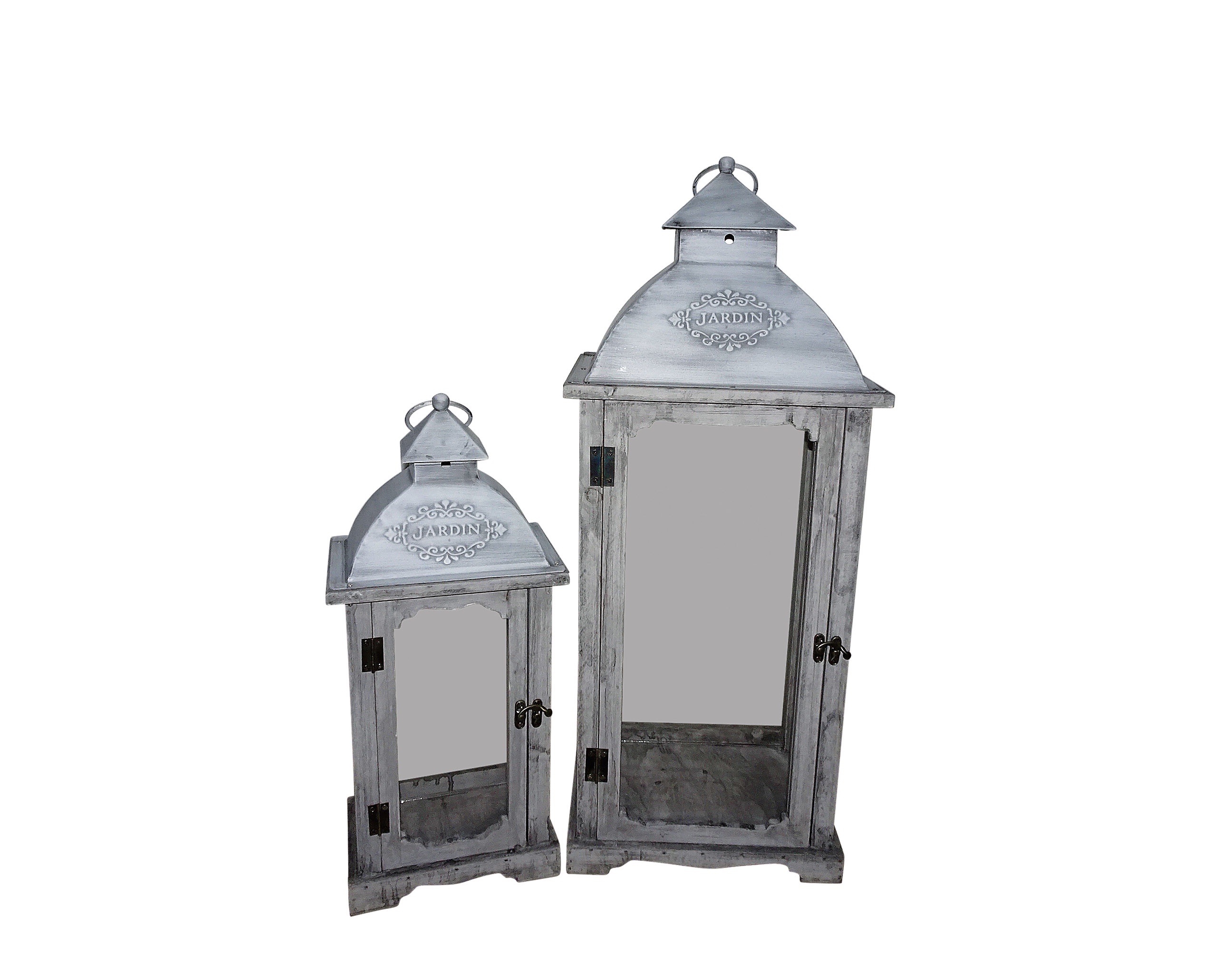 Sivý drevený lampáš so sklenenou výplňou so sivou kovovou strieškou a s ošúchaným vintage vzhľadom 26,5 x 20,5 x 63 cm 37792