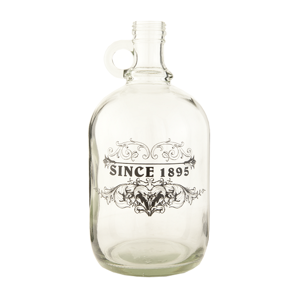 Sklenená fľaša ako malý demižón s uškom a s etiketou s dekorom z dielne holandskej značky Clayre & Eef. Fľaša na závit je ako malý demižón vhodný na destiláty, víno alebo iné.
