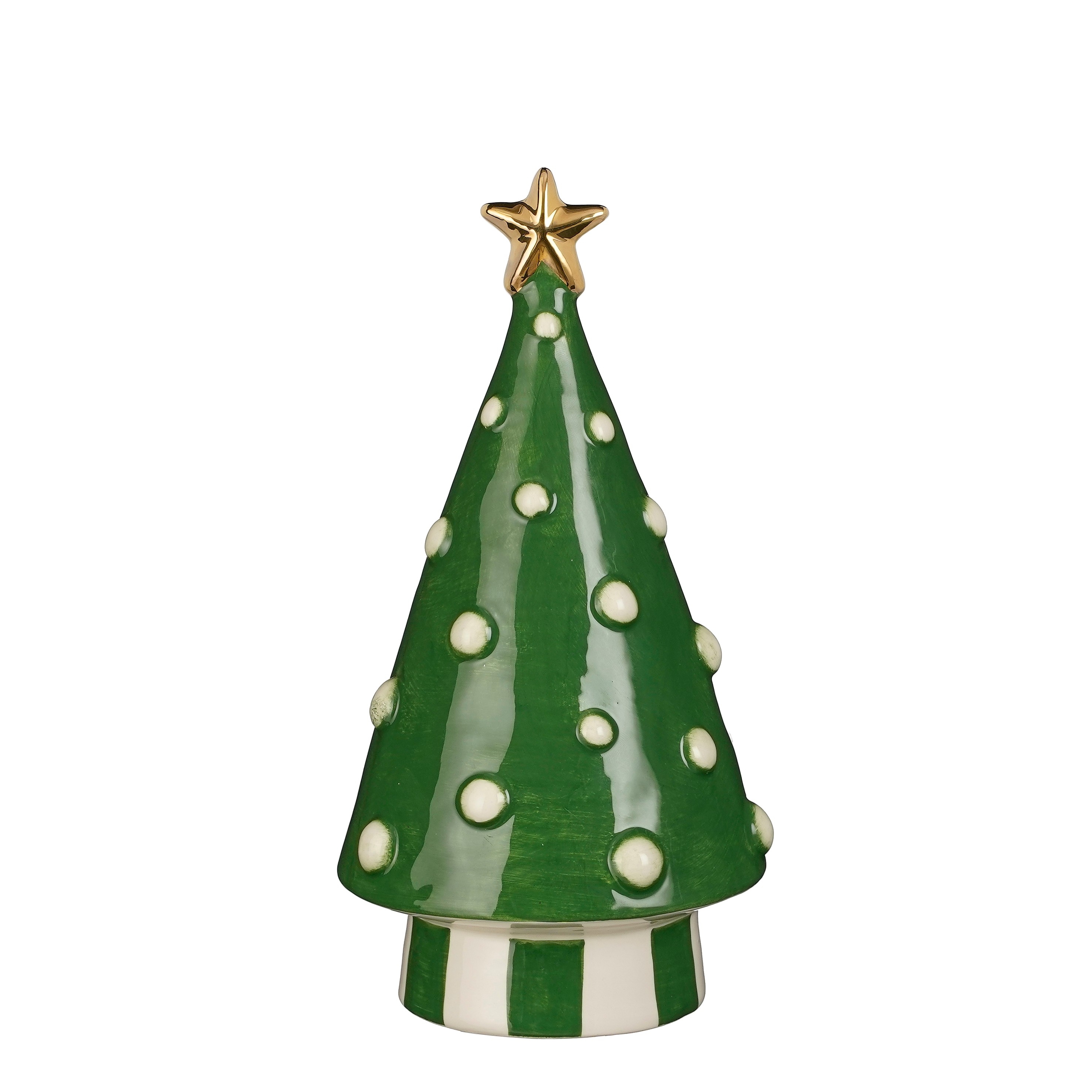 Keramická dekorácia stromčeka v bielo-zelenom farebnom prevedení so zlatou hviezdičkou. Jemná dekorácia do Vášho domova na navodenie príjemnej vianočnej atmosféry. Krásny a elegantný doplnok do Vašej vianočnej výzdoby. Rozmer vianočného stromčeka je 12,5 x 24 cm. Materiál: Keramika.