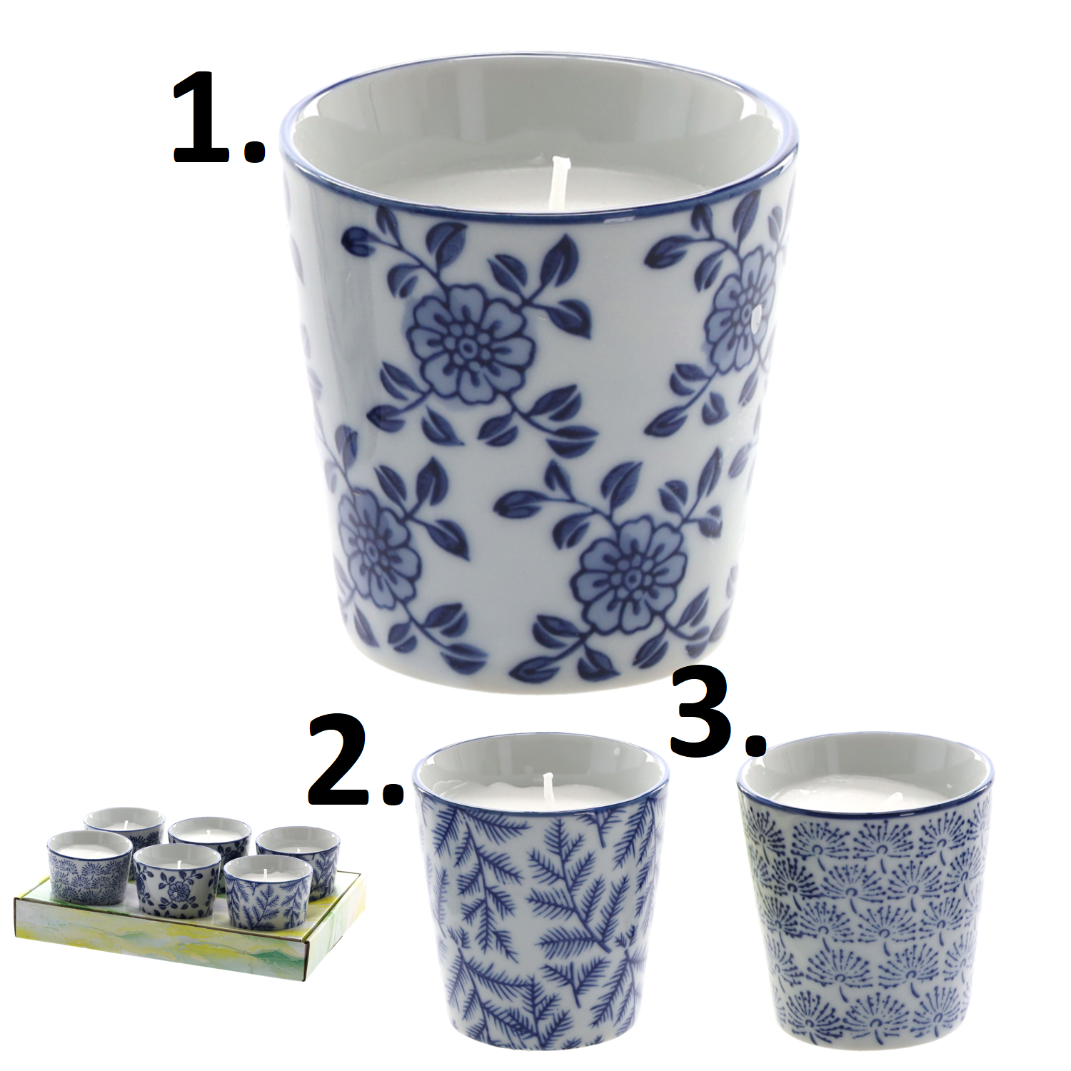Sviečka Citronella proti komárom v keramickom bielom poháriku s modrým dekorovaním 7,5 x 7,5 cm 39519 - obrázok 1