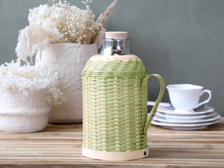 Termoska- džbán v bambusovom pletenom obale vo vintage štýle od dánskych dizajnérov Chic Antique. Džbán je sklenený, potiahnutý bambusovým výpletom, ktorý mu dodáva krásny vidiecky vzhľad. Termoska vo francúzskom provensálskom štýle má rozmery 26 x 14 cm a objem 1,3l. Vintage termoska je ideálna pre Váš obľúbený nápoj a taktiež aj ako ozdoba do bytu či domu.