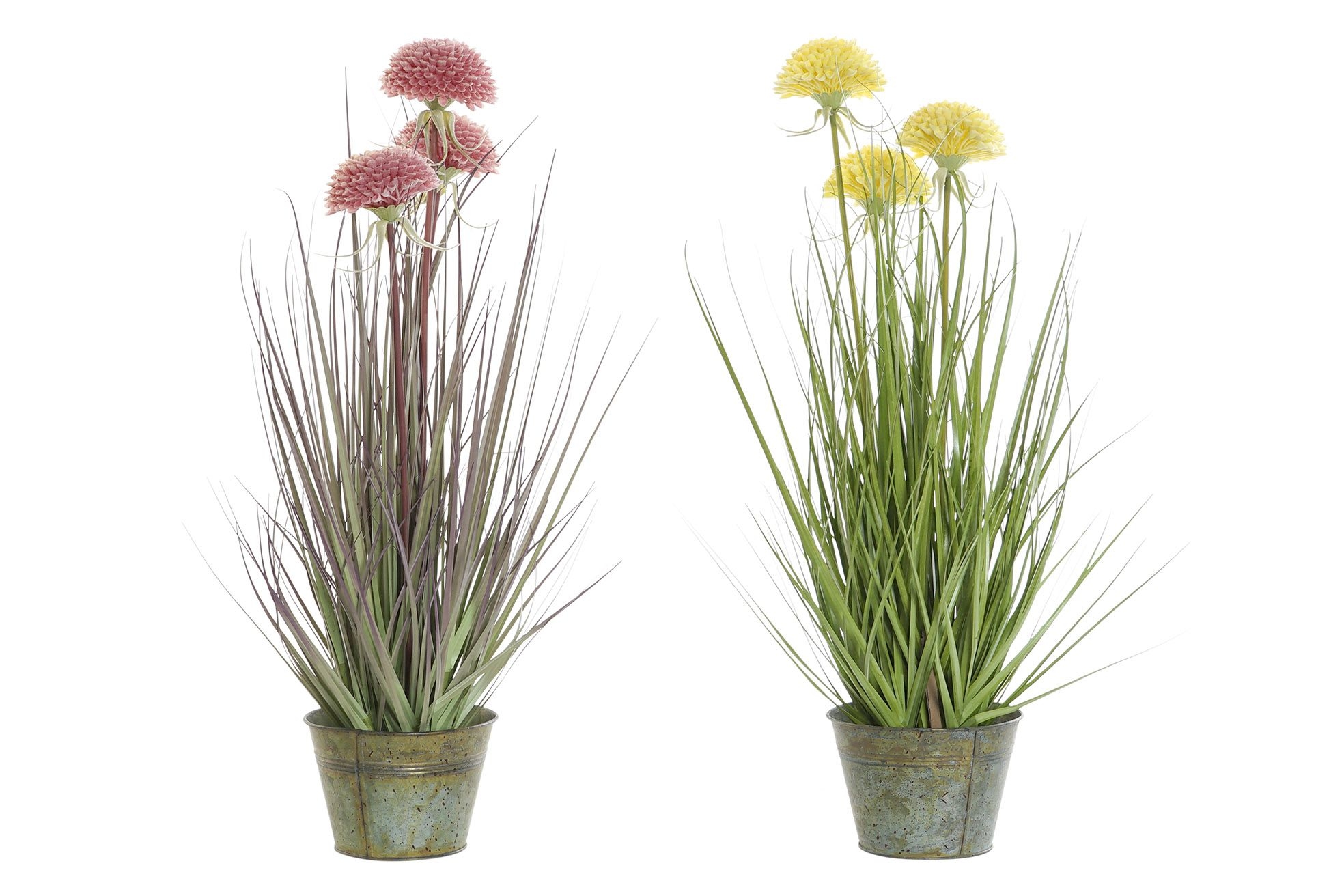 Umelá tráva s ružovými, alebo žltými kvetmi v kovovom kvetináči opotrebovaného vzhľadu. Na výber z dvoch variant - ružové alebo žlté kvietky. Výška rastliny je 60 cm. Krásny doplnok do Vášho domova.