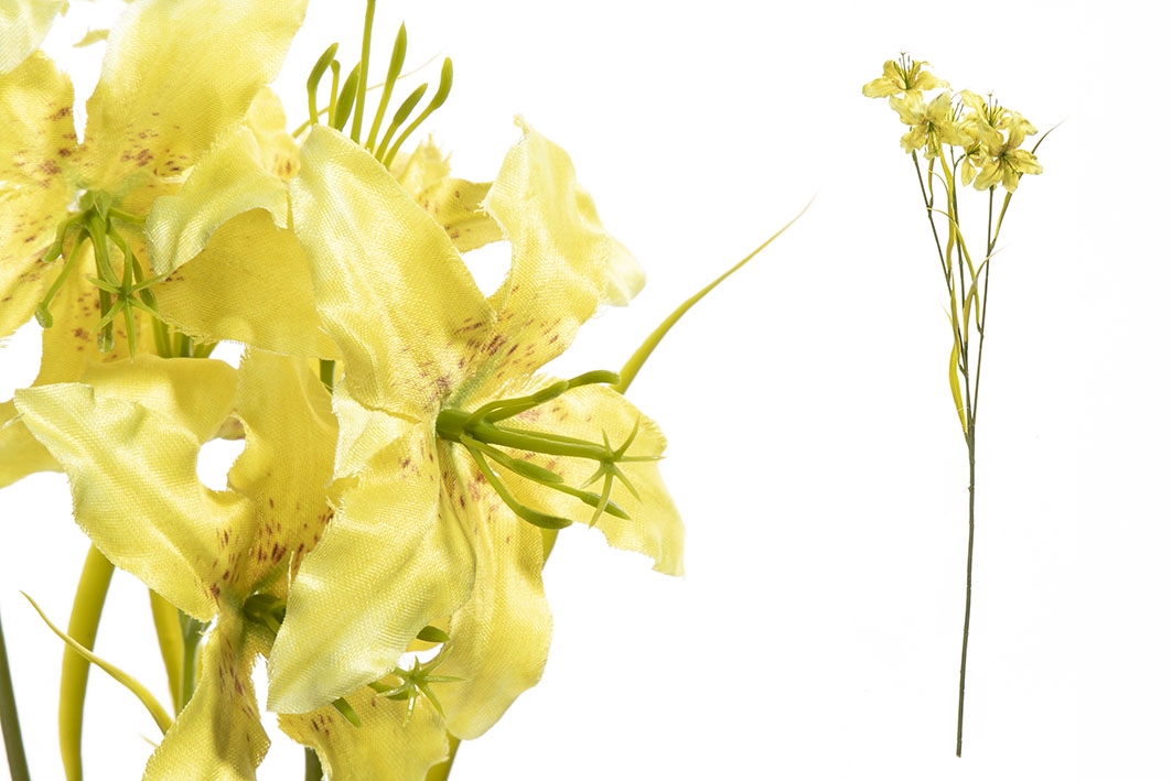 Umelá dekorácia kytičky ľalií v žltom farebnom prevedení so zelenými lístkami je krásnou dekoráciou či už do interiéru alebo do exteriéru. Vďaka nezvyčajnému vzhľadu prinesie do Vášho domova krásnu atmosféru. Oživte si svoj domov touto neuveriteľne krásnou ľaliou, na pohľad úplne ako živou. Celková dĺžka kytičky je 62 cm.