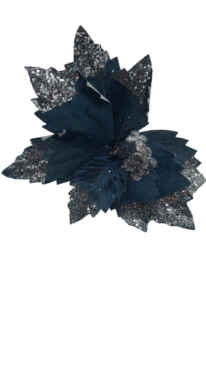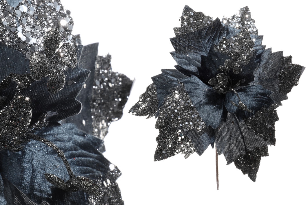 Umelá dekorácia tmamodrej vianočnej ruže s čiernymi trblietkami 30 cm 38660