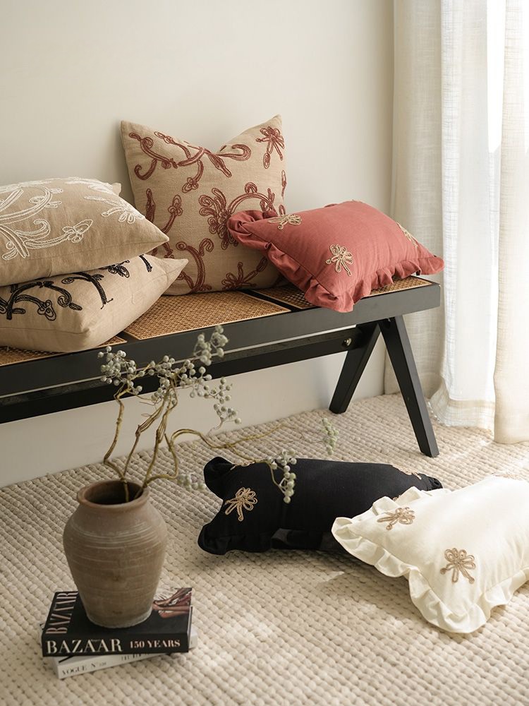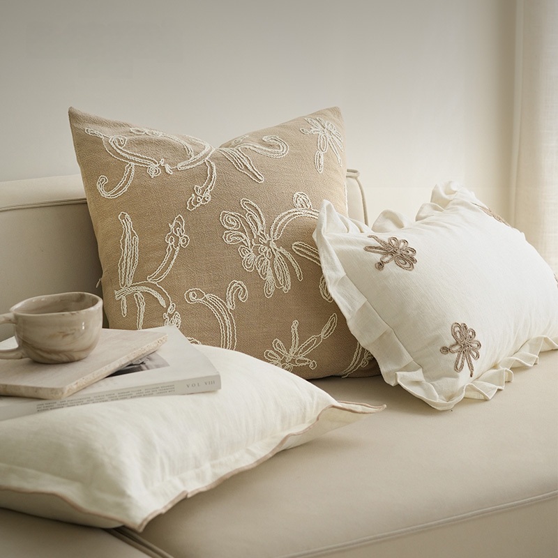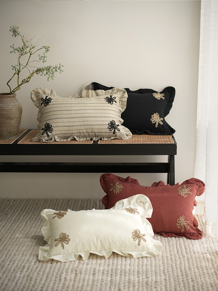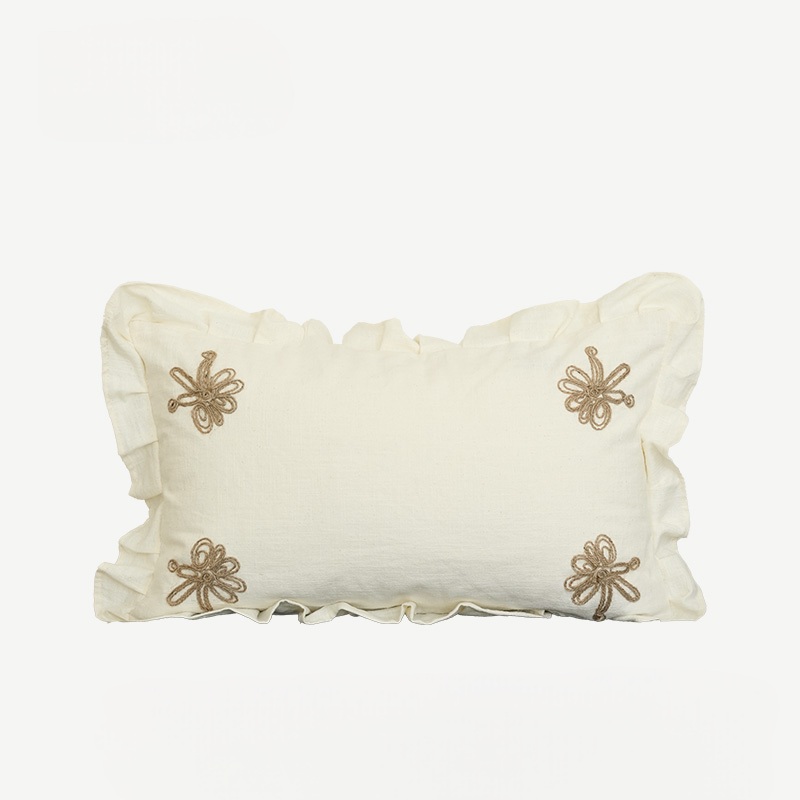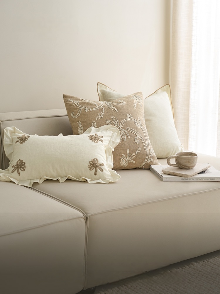 Kombinácia ľanu a bavlny zabezpečuje prirodzený vzhľad, kvalitné spracovanie a príjemný pocit pri používaní. Dekoratívne volány zvýrazňujú elegantný charakter vankúša a robia z neho ideálny doplnok do obývačky, spálne alebo oddychovej zóny.