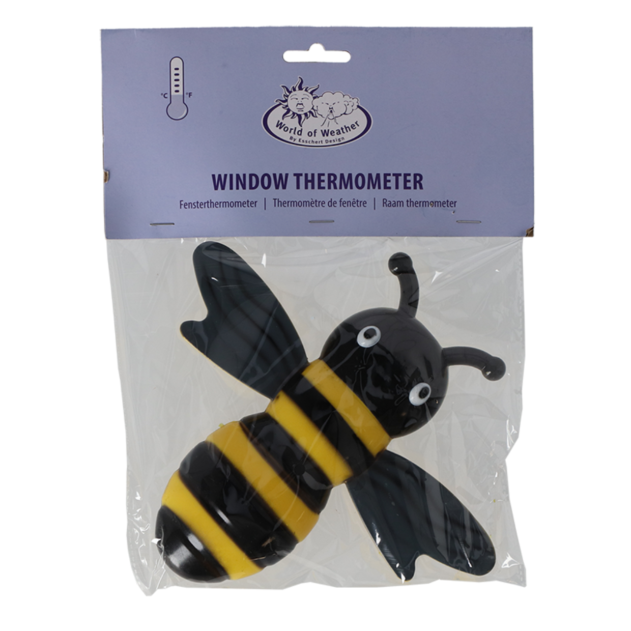 Záhradná plastová dekorácia teplomeru v tvare včielky v žlto-čiernom farebnom prevedení z dielne holandskej značky Esschert Design. Teplomer indikuje teploty v stupňoch Celzia a Fahrenheita a je vhodný do interiéru, tak ako aj do exteriéru. Teplomer je možné jednoducho nalepiť na okno.
