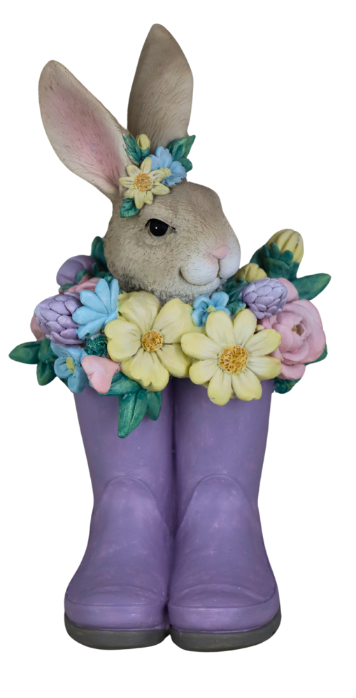 Zajac polyresin vo fialových čižmách s kvietkami 13x12x23 cm 45737